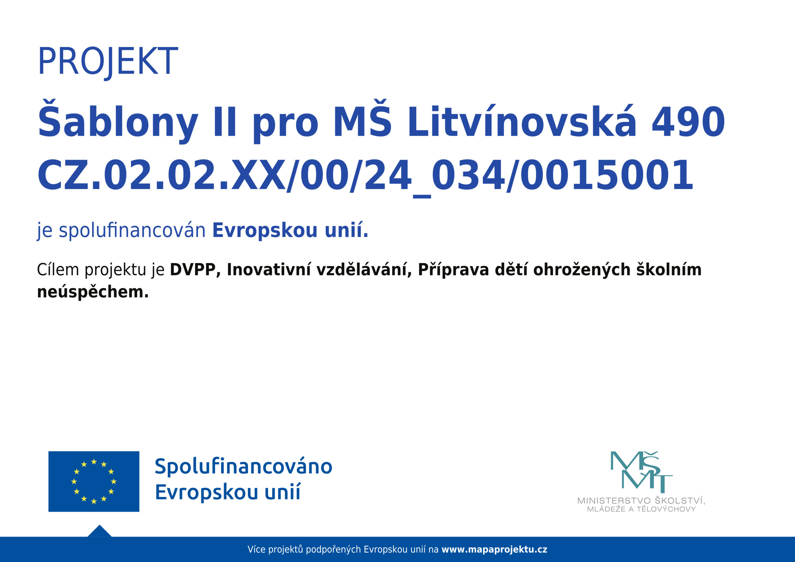 Šablony II pro MŠ Litvínovská 490 CZ.02.02.XX/…001 01.10.2025 – 30.09.2027 541 344,00 Kč DVPP, Inovativní vzdělávání. Příprava dětí ohrožených školním neúspěchem v MŠ.
